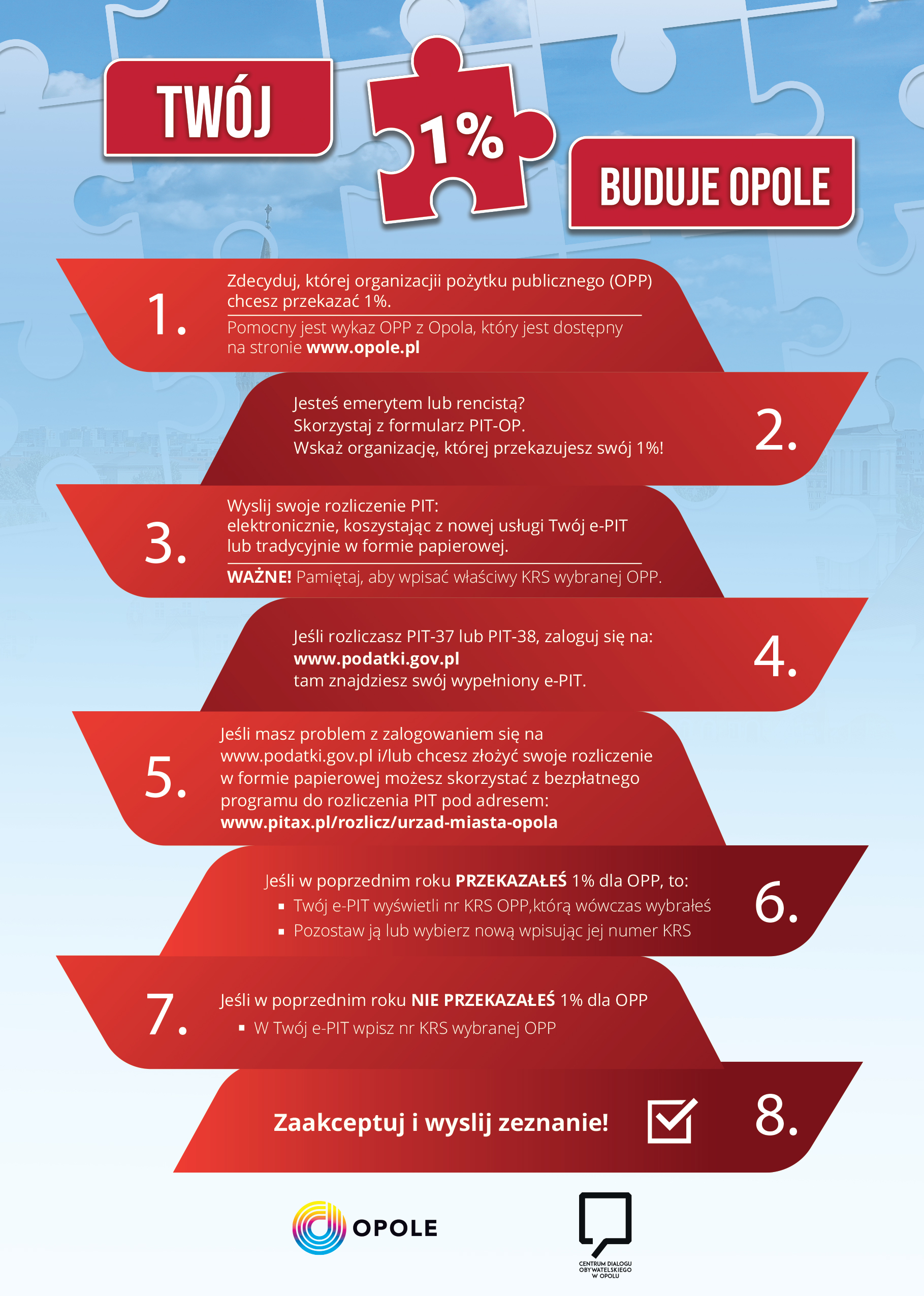 - ulotkę z wykazem OPP posiadających siedzibę w Opolu, uprawnionych do pozyskania 1% (ulotka do pobrania w wersji papierowej miedzy innymi w Centrum Dialogu Obywatelskiego ul. Damrota 1 oraz w wersji elektronicznej poprzez stronę www.opole.pl )