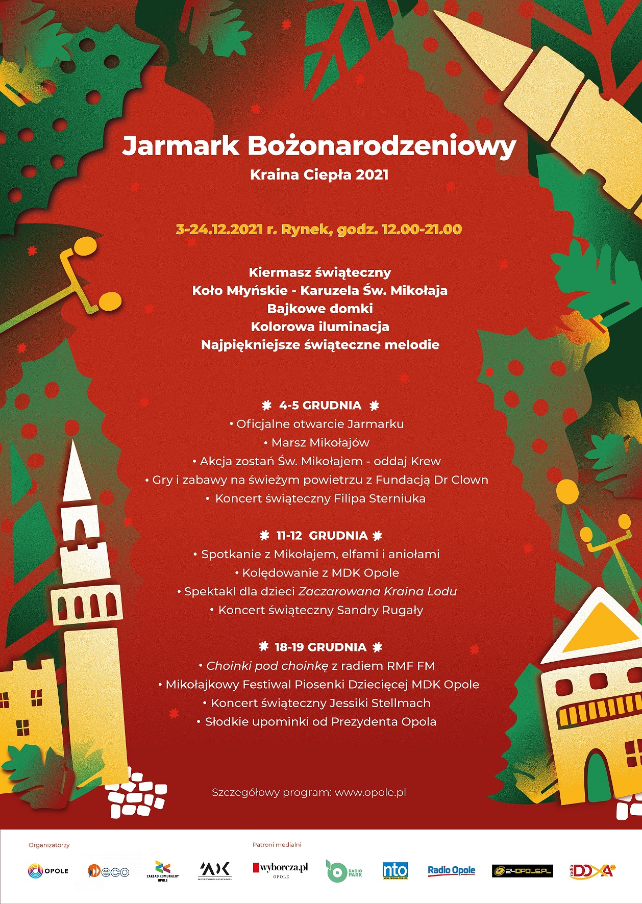 Święta Bożego Narodzenia to czas szczęścia, życzliwości i miłości oraz wyjątkowe chwile spędzone z rodziną i przyjaciółmi. Jak co roku, w tym właśnie okresie, zapraszamy do wspólnego kolędowania i biesiadowania podczas Jarmarku Bożonarodzeniowego. Codziennie do 24 grudnia na Rynku w Opolu można skorzystać z bogatej oferty przygotowanej przez kilkudziesięciu wystawców z rękodziełem i ozdobami świątecznymi. W domkach handlowych można zakupić również świąteczne przysmaki.