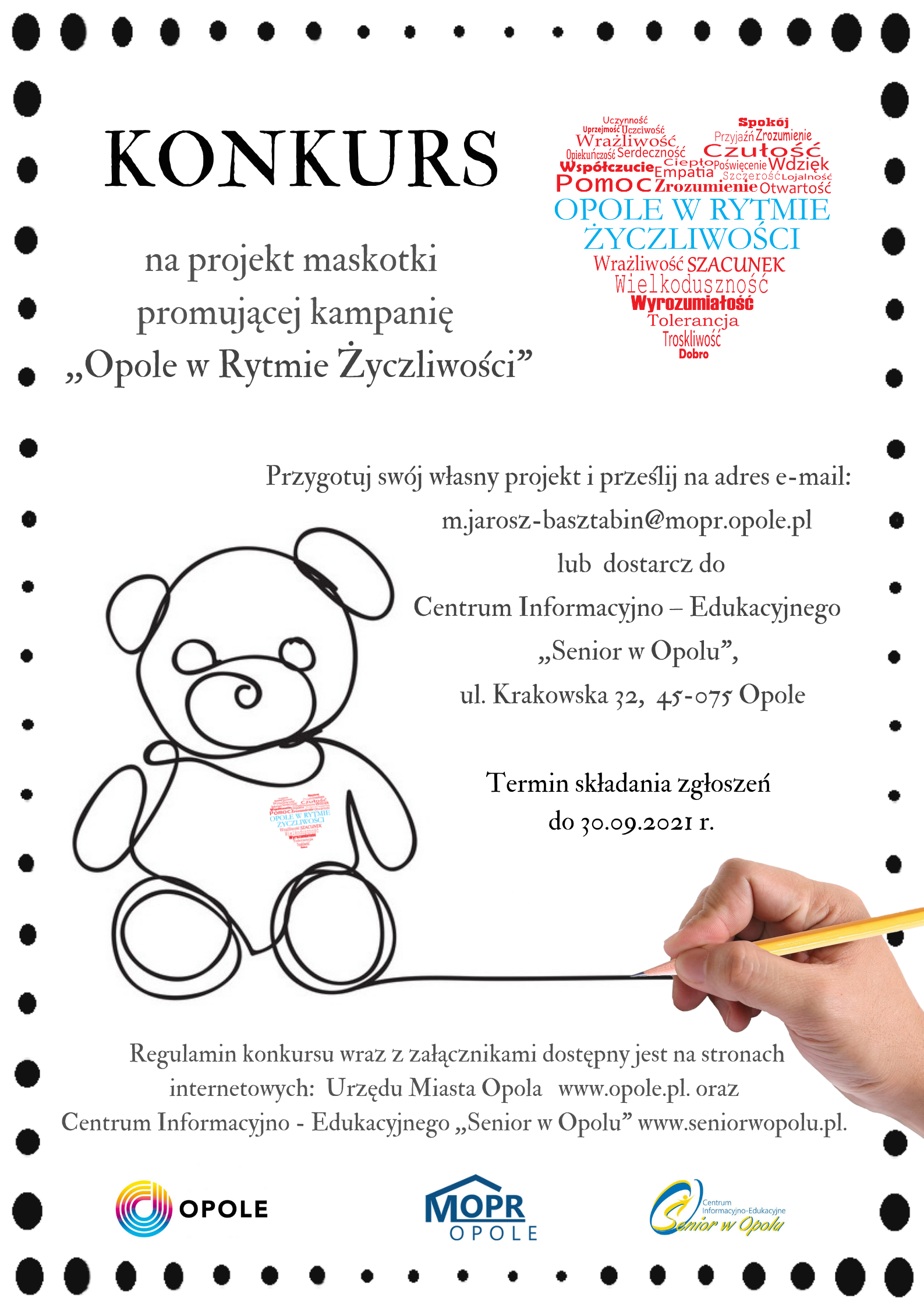 Wydział Polityki Społecznej i Centrum Senior w Opolu zachęcają do wzięcia udziału w konkursie plastyczno – technicznym, którego celem jest przygotowanie projektu maskotki promującej kampanię ,,Opole w Rytmie Życzliwości”. Konkurs skierowany jest do mieszkańców Miasta Opola. Każdy uczestnik konkursu może również zaproponować imię dla maskotki.