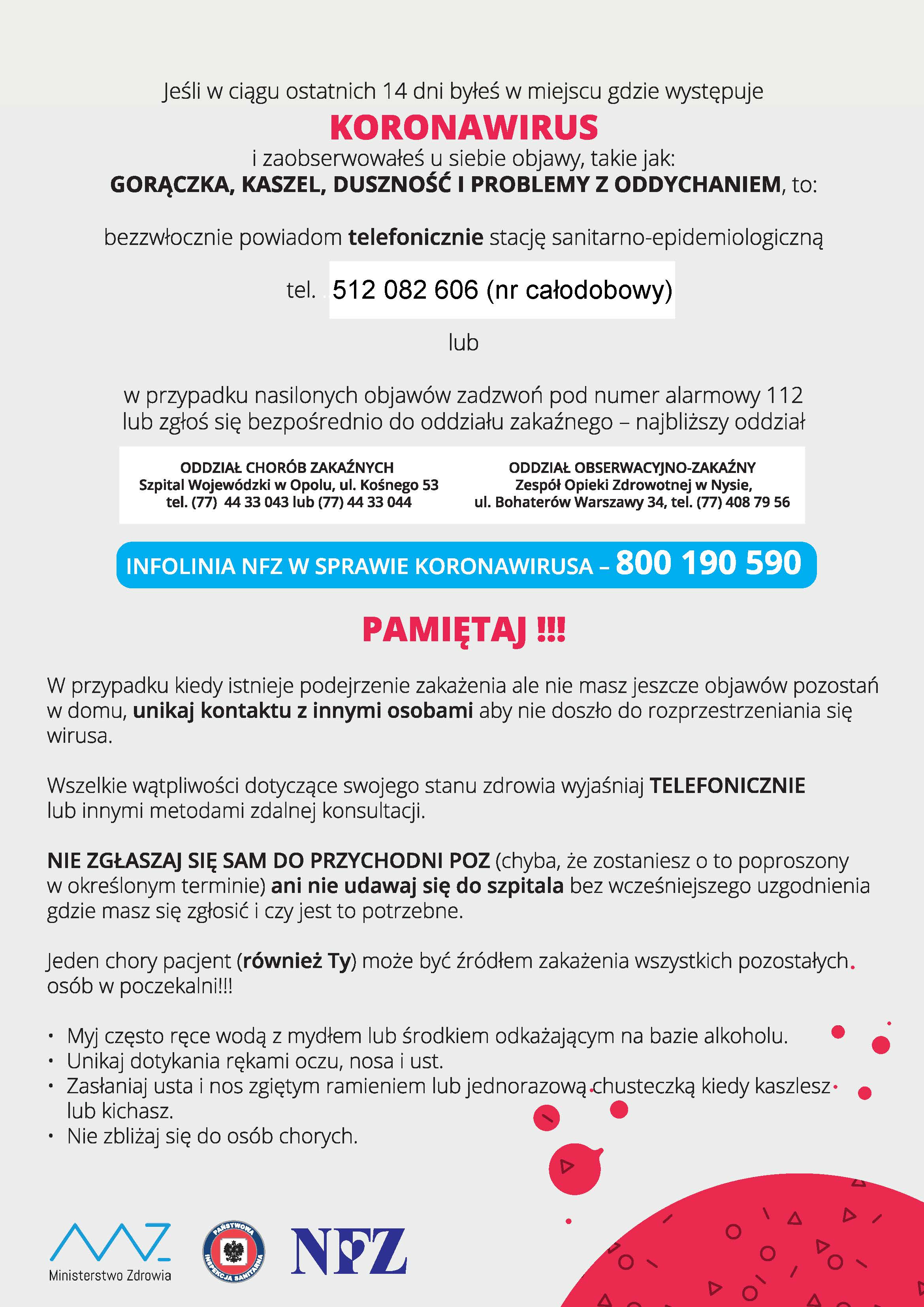 Podejrzewasz, że mogłeś zarazić się koronawirusem? Zgłoś się telefonicznie do Powiatowej Stacji Sanitarno-Epidemiologicznej w Opolu (512 082 606). W przypadku nasilonych objawów należy zadzwonić pod numer alarmowy 112 lub zgłosić się bezpośrednio do oddziału zakaźnego (Oddział Chorób Zakaźnych Szpitala Wojewódzkiego – 77 44 33 043/044, Oddział Obserwacyjno-Zakaźny Zespołu Opieki Zdrowotnej w Nysie 77 408 79 56). W sprawie koronawirusa uruchomiono także infolinię NFZ (800 190 590).
