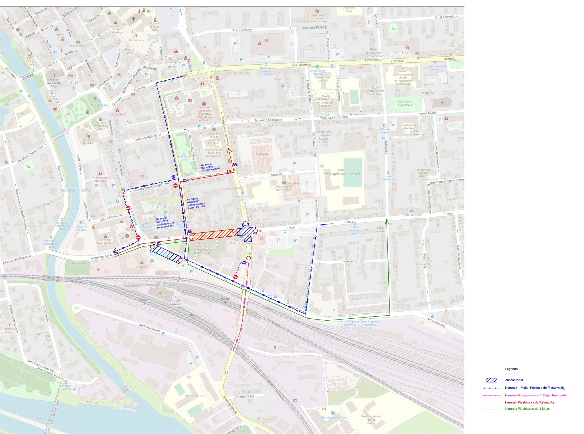 Samochody jadące w kierunku Groszowic od ulicy Ozimskiej będą jechały przez Kołłątaja, Damrota, Krakowską, 1 Maja, następnie łącznikiem do Armii Krajowej i wjazd na wiadukt od strony parkingu przy PKP.