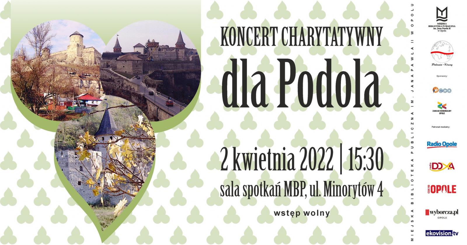 Miejska Biblioteka Publiczna oraz Towarzystwo Polonia-Kresy zapraszają na koncert charytatywny. Wystąpią aktorzy scen opolskich: Andrzej Mikosza, Bogdan Zieliński, a także Chór Old Singers i Walentyna Katuszyńska z Kamieńca Podolskiego. W trakcie wydarzenia usłyszymy wiersze Stefana Wiśniewskiego z tomu „Nie opuszczę Cię Podole” oraz utwory z płyty „Podole na dwa głosy”, które będzie można nabyć podczas koncertu. Zebrane środki finansowe zostaną przekazane Polskiemu Kulturalno-Oświatowemu Stowarzyszeniu im. Józefa Rollego z Kamieńca Podolskiego, miasta, do którego przybywają uchodźcy ze wschodniej Ukrainy.