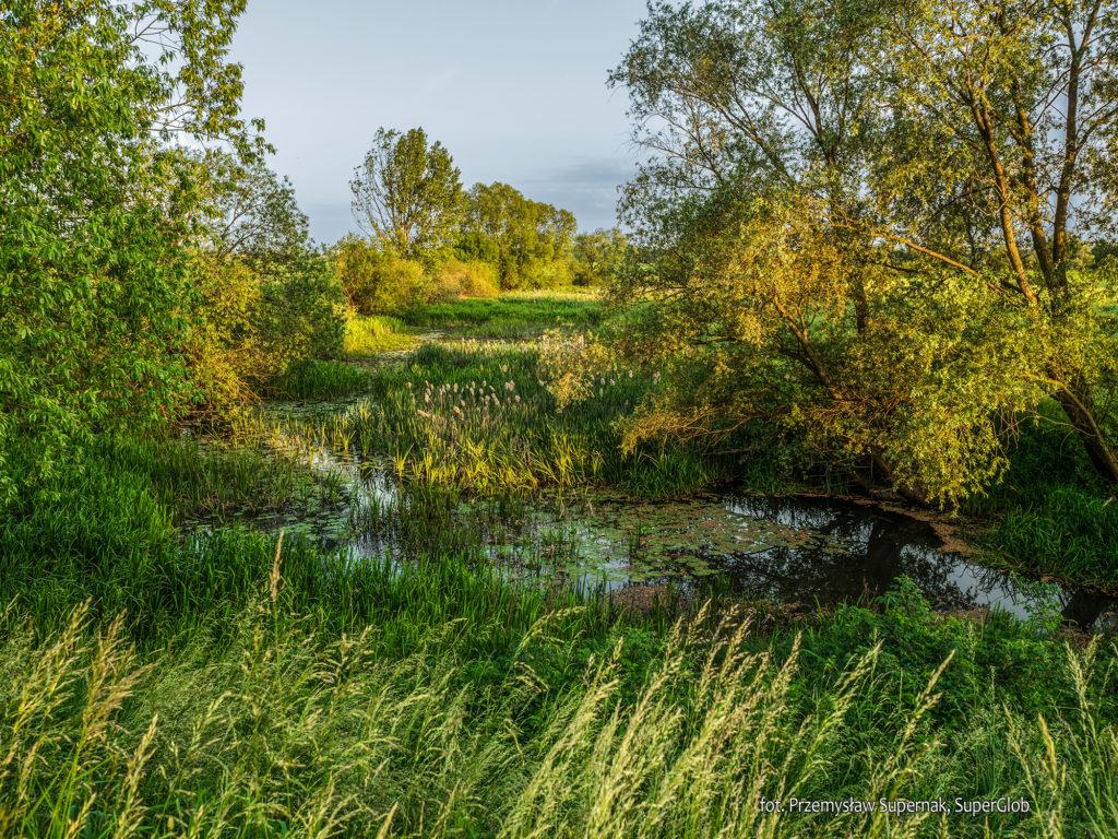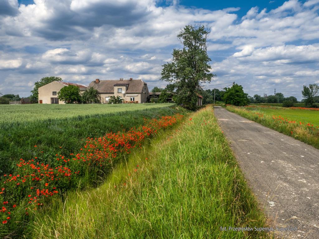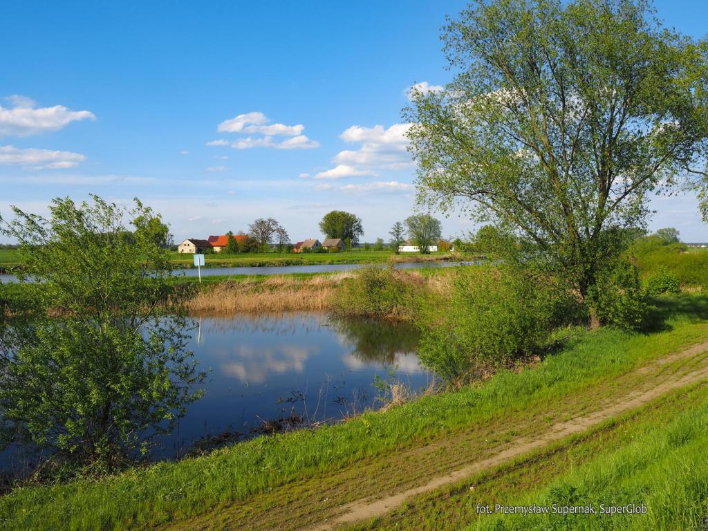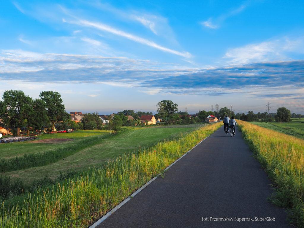 W Niewodnikach mijamy mały cmentarz i kiedy zaczyna się asfalt, dojeżdżamy do ul. Odrzańskiej. Tu skręcamy ostro w prawo. Na tym skrzyżowaniu możemy też pojechać prosto i dojechać do centrum wioski, gdzie znajduje się zabytkowy pałac z niewielkim parkiem. Kiedyś był tu hotel i klimatyczna restauracja. Obecnie prywatny właściciel nie udostępnia pałacu zwiedzającym i można go obejrzeć jedynie zza ogrodzenia. Po krótkim objeździe wokół Niewodnik wracamy z powrotem na ul. Odrzańską i wyjeżdżamy nią z wioski w kierunku Odry. To bardzo malowniczy fragment trasy. Wygodna, asfaltowa droga wije się serpentynami pośród ukwieconych łąk i drzew. Po drodze mijamy zarośnięty trzciną niewielki staw i docieramy do rozstaju dróg. W prawo skręca Szlak św. Rocha, którym możemy sobie skrócić naszą trasę, dojeżdżając przez most na śluzie do Dobrzenia Wielkiego. My jedziemy w lewo i dojeżdżamy do wału Odry, przy którym kończy się asfalt, a droga zakręca w lewo.